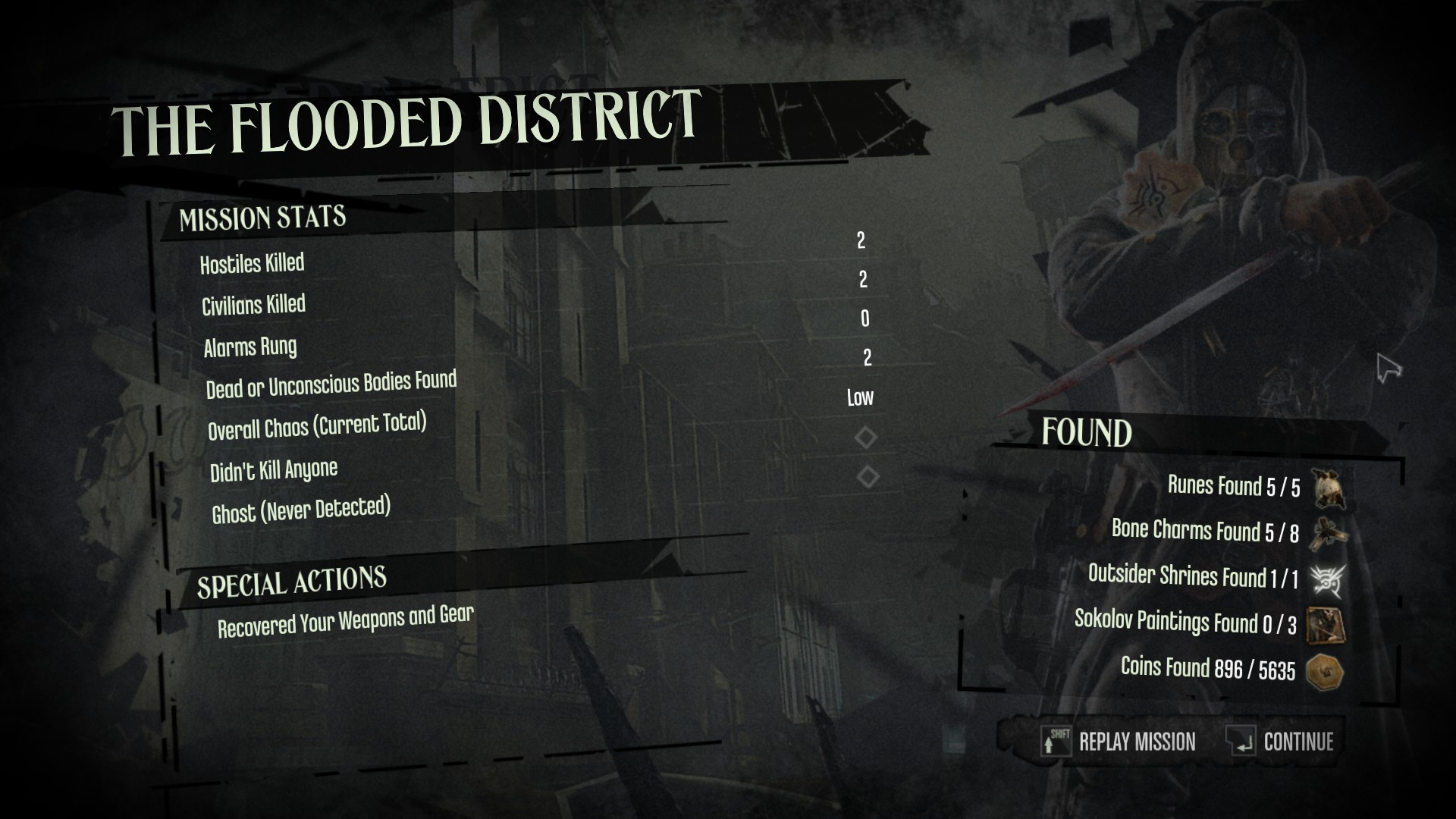 The storylines of two central antagonists reach their denouement here, with Daud as the main target and an optional boss fight with Granny Rags. Stopping time to try and grab Daud's stuff only for him to say (in Michael Madsen's gravelly voice), "nice try, Corvo" and engage you anyway is an extremely cool moment, and he is a pretty tough cookie. He managed to kill me, and eventually I went and just grabbed his stuff and Blinked away - which feels more proper given the events of later games. Granny is a fun fight as well, as if you wish to take her down you'll have to stay on the move as she summons carpets of rats to harry you while you try and burn her cameo and banish her.